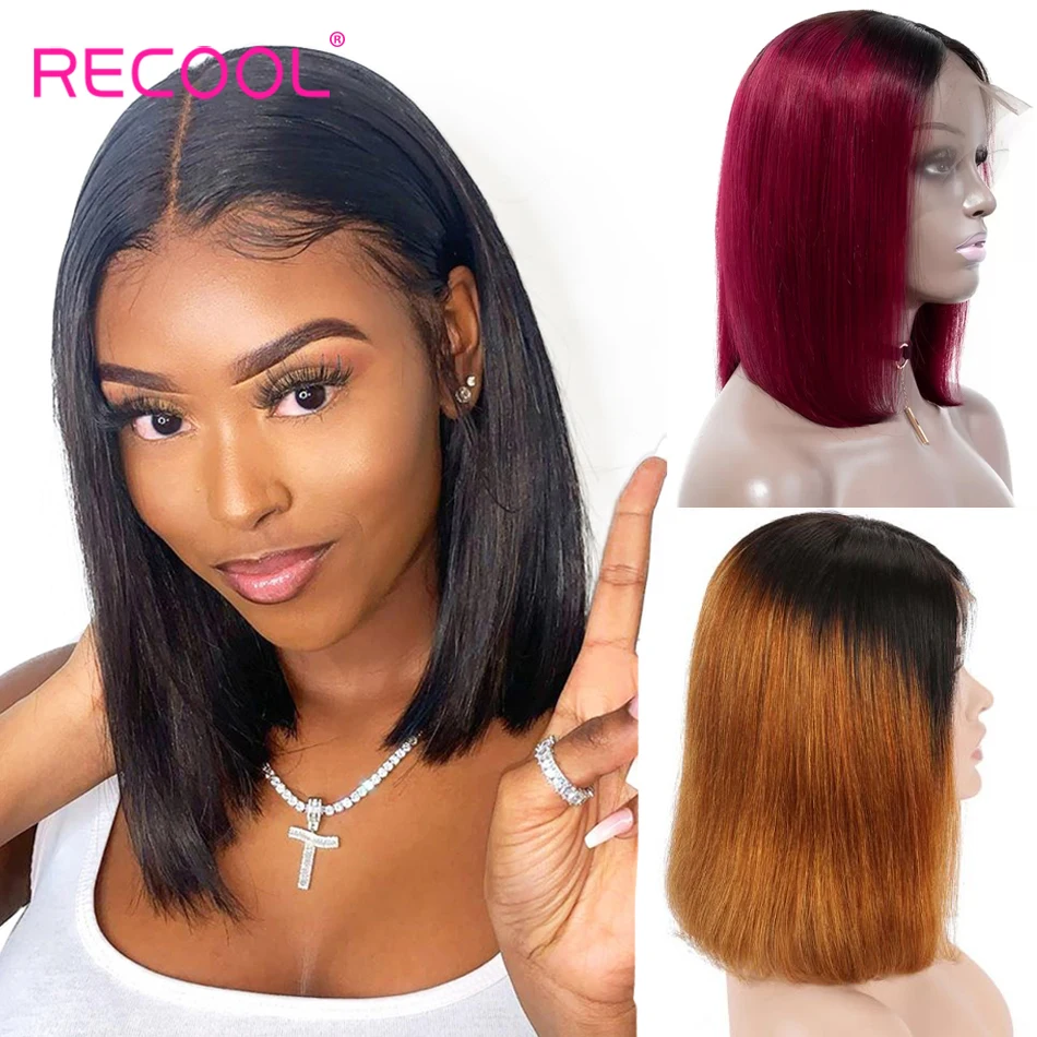 Mejor Pelucas de encaje de Recool Official Store por Recool Borgoña Bob corto recto pelucas delanteras de encaje 4X4 cierre pelucas rubio miel Ombre Frontal de encaje pelucas de cabello humano Pre arrancado