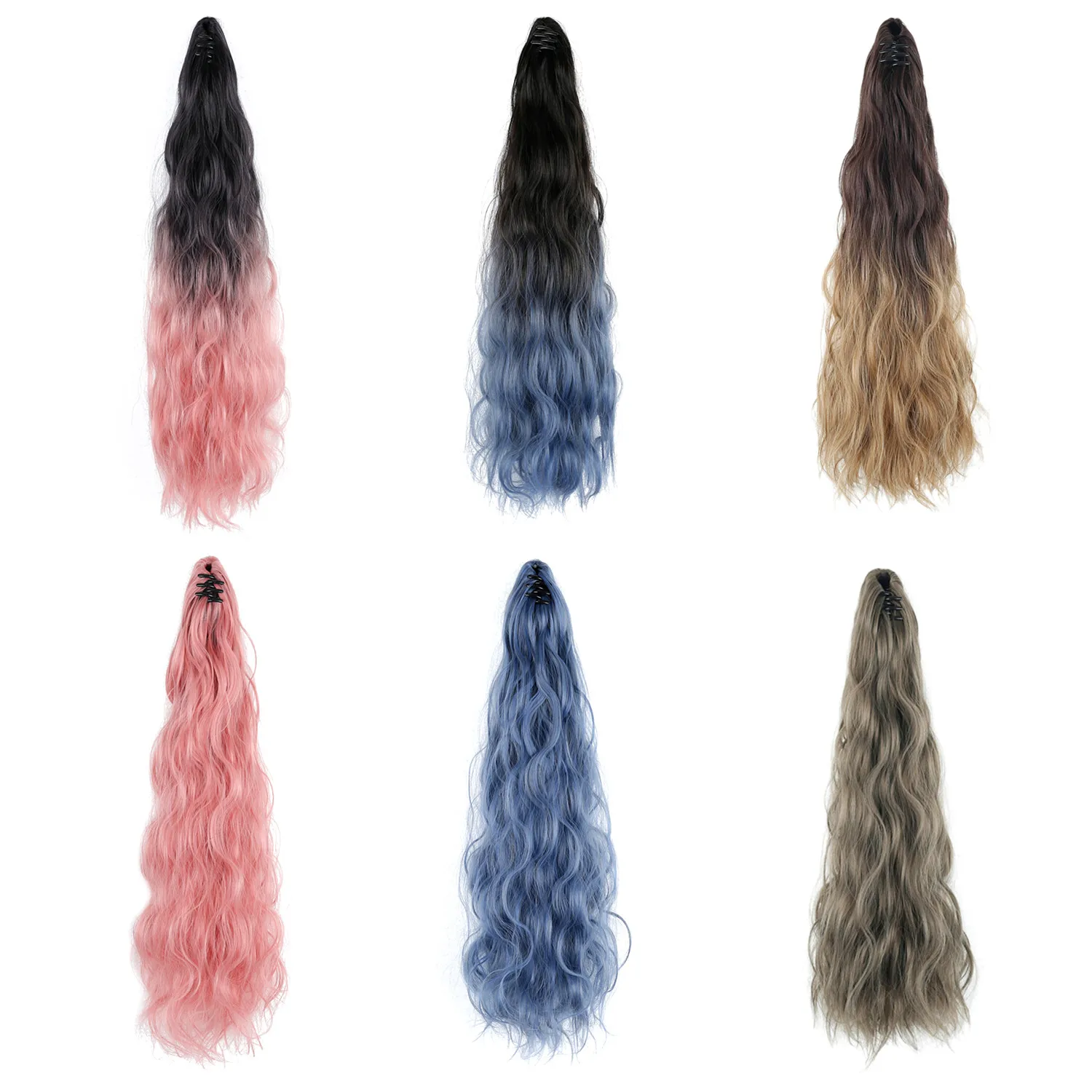 Name: Coleta de colores degradados sintética para mujer, extensiones de cabello con Clip, estilo rizado ondulado, cola de poni, peinado azul y rosa
