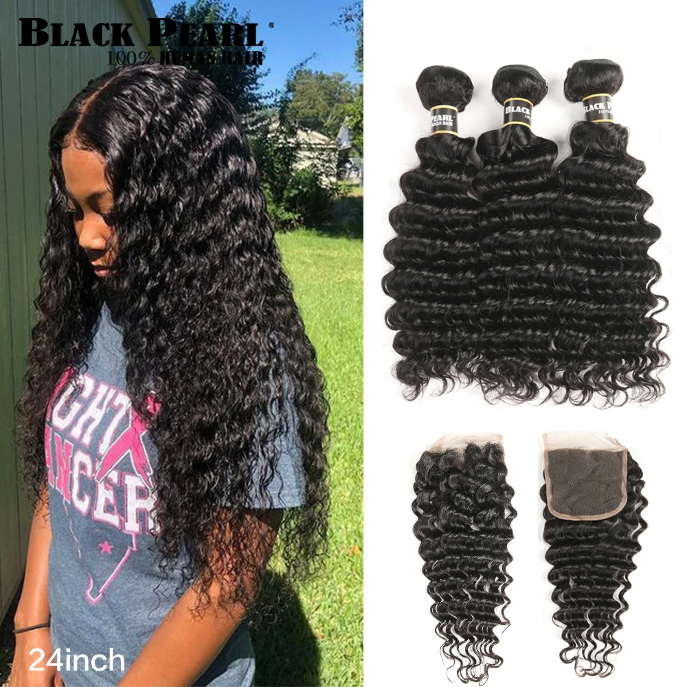 Gran oferta Mechones de pelo humano Remy con Perla Negra y ondas profundas, mechones de 30 pulgadas con cierre, 3 mechones DolGYaEekDp