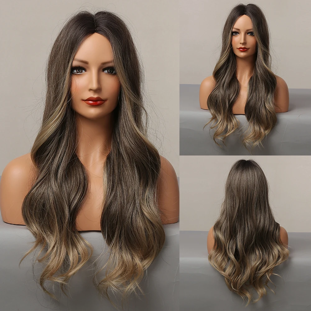 Name: ALAN EATON-Peluca de cabello sintético para mujer, cabellera artificial largo ondulado, color ombré, negro, marrón oscuro, para Cosplay, resistente al calor